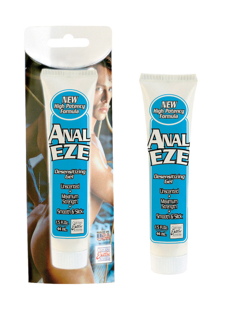 Anal Eze is a desensitizing gel used to enhance the pleasure of anal penetration. New high potency formula. Desensitizing gel works great when performing anal sex. Maximum strength. Smooth and silky. Unscented gel comes in a 1.5 fluid ounces or 44ml e. Category: More Fun, Oils, Potions and Lubricants. Anal Eze Gel is a registered trademark for California Exotic Novelties. Sex toys and sexual wellness. Made in the USA. New images for 2013.