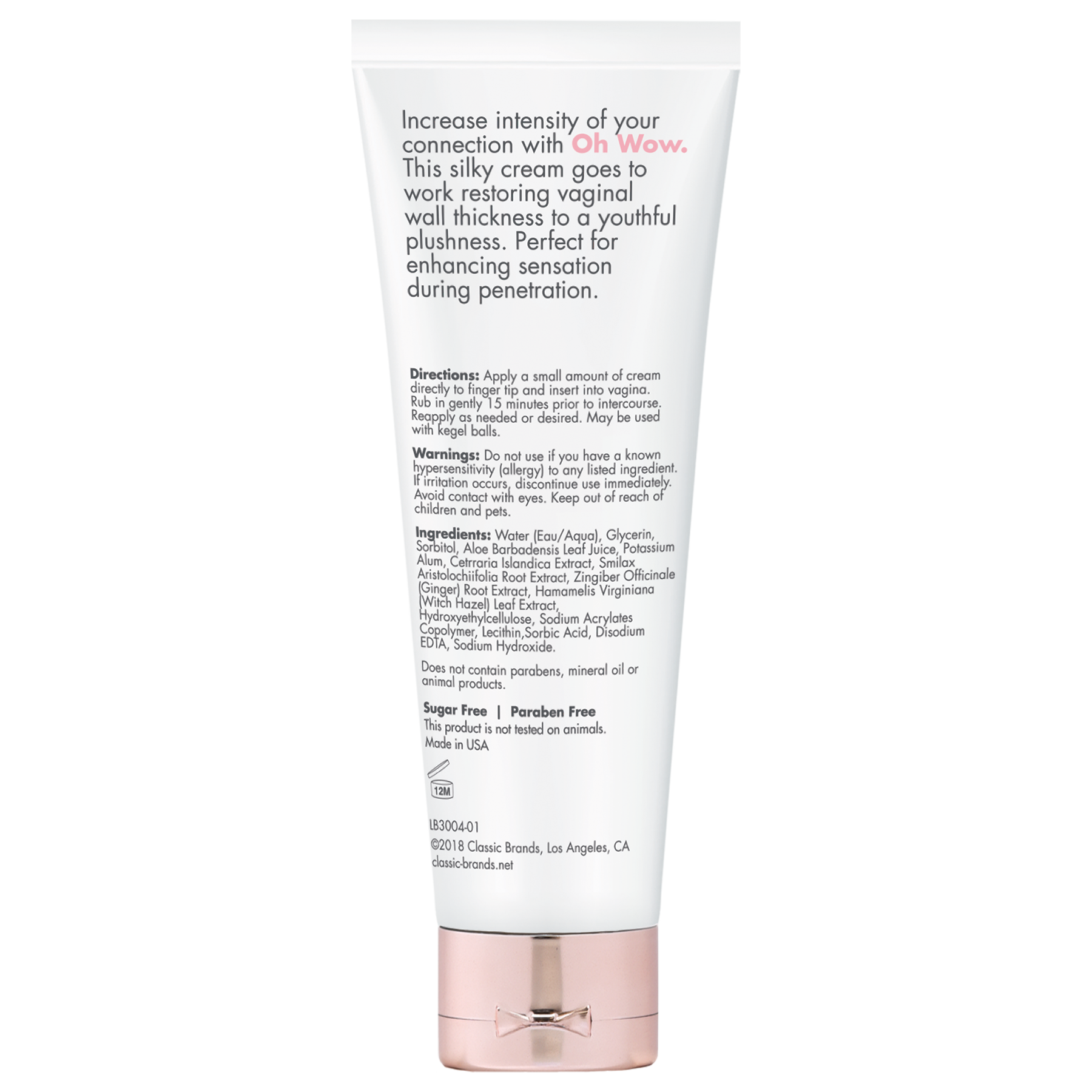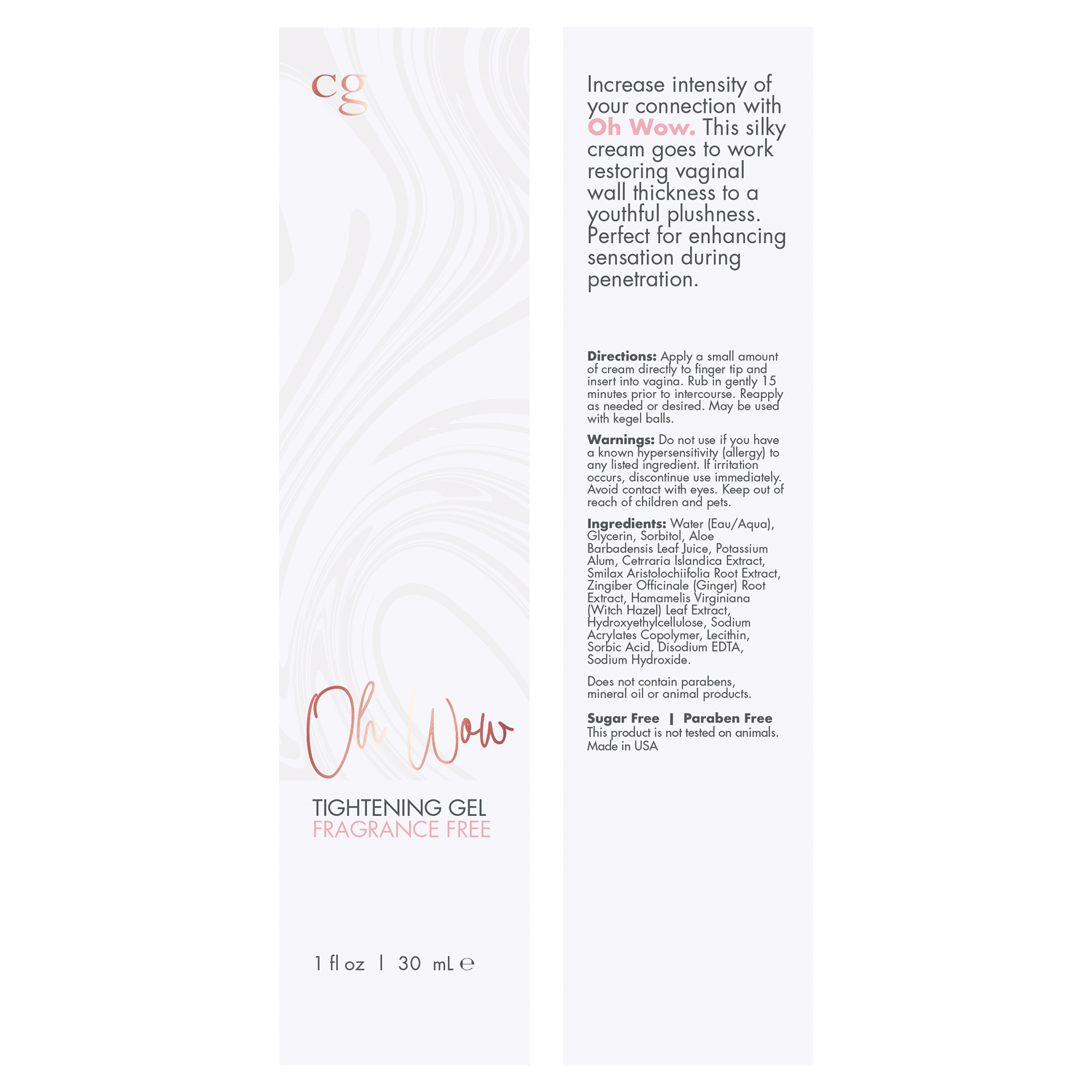 CGC Oh Wow Tightening Gel 1 fluid ounce Au Naturel from Classic Erotica. Increase intensity of your connection with Oh Wow. This silky cream goes to work restoring vaginal wall thickness to a youthful plushness. Perfect for enhancing sensation during penetration. How to use: apply a small amount of cream directly to finger tip and insert into vagina. Rub in gently 15 minutes prior to intercourse. Reapply as needed or desired. May be used with Kegel balls. Warnings: do not use if you have a known hypersensitivity allergy to any listed ingredient. If irritation occurs, discontinue use immediately. Avoid contact with eyes. Keep out of reach of children and pets. Silky cream, ideal for enhancing connection during intimacy. Formulated to temporarily enhance sensation during penetration. Fragrance free. Ideal for toy, self and couple's play. This product does not contain gluten or sugar. This product does not contain parabens or mineral oil. This product is not tested on animals. Ingredients: Water, Glycerin, Sorbitol, Aloe Barbadensis Leaf Juice, Potassium Alum, Cetrraria Islandica Extract, Smilax Aristolochiifolia Root Extract, Zingiber Officinale Ginger Root Extract, Hamamelis Virginiana Witch Hazel Leaf Extract, Hydroxyethylcellulose, Sodium Acrylates Copolymer, Lecithin, Sorbic Acid, Disodium EDTA, Sodium Hydroxide. Made in the USA. Categories: Erotic Body Lotions, Gel, Health and Beauty Aids, Hygiene, Intimate Care. Restricted, Amazon Restricted. 2022.