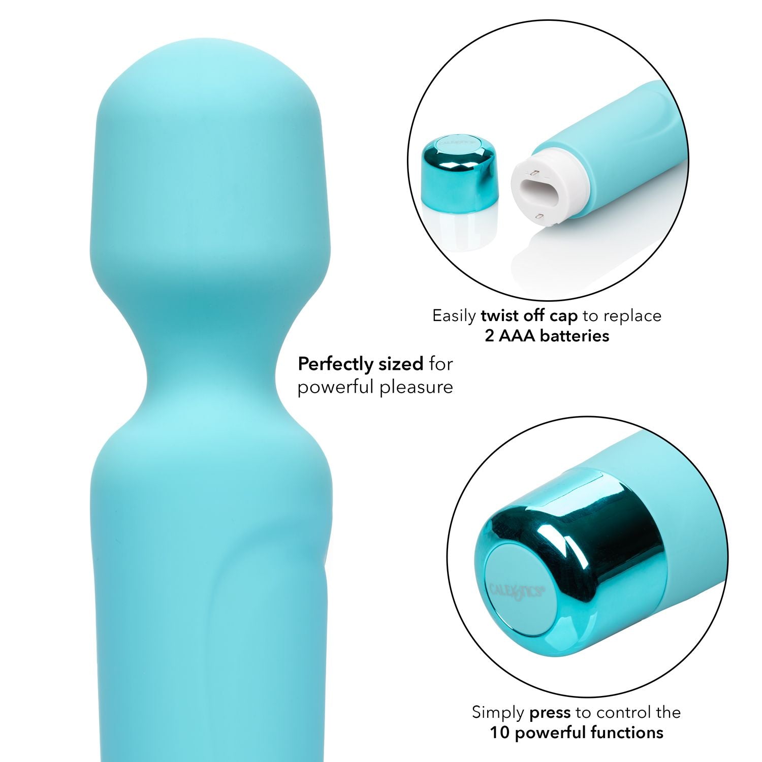 Eden Wand Green Massager from California Exotic Novelties. Color Teal Green. Materials Silicone, ABS Plastic with Metallic Plating. Power source 2 AAA batteries, not included.
