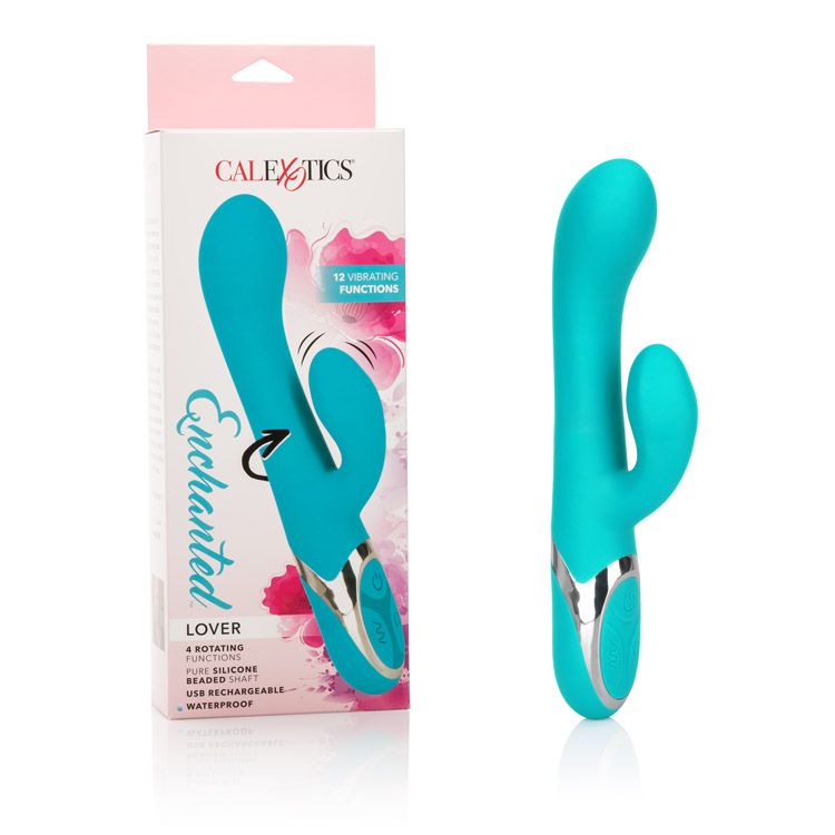 Enchanted Lover Rabbit Vibrator from Cal Exotics. Multiple rows of non-jamming pleasure beads. This item features a state of the art memory chip that will resume on the last function used. Reignite the pleasure, right where you left off. Designed for easy use, you will find operation a snap even on the darkest night. Frustration free and perfect for pleasure, just one push brings intense stimulation your way. Bulk weight 9.9 oz. Materials Silicone, ABS Plastic Metallic Plating. Functions a variable speed control takes you to the height of gratifying pleasure. You will find sensual stimulation that throbs with excitement. 12 functions bring you thrilling elements of vibration, pulsation, and escalation. Experience the ultimate bedroom adventure! Exciting rotating action means sensual pleasure. You will be stimulated and gratified in no time at all. Warranty information order with confidence as this item comes with our standard 90 day warranty. Battery information this product includes USB charging capabilities. Measurements 5 inches by 1.5 inches shaft. 2.25 inches by 1.25 inches stimulator.