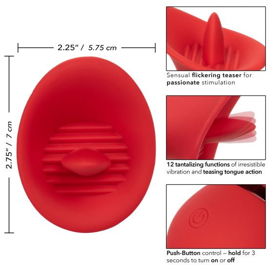 French Kiss Seducer Massager from California Exotic Novelties. Compact hand held vibrator. You have never been kissed like this. The sensual French Kiss Seducer is ready to slip into your purse or overnight bag for orgasmic pleasure on the go. The compact massager is sure to deliver powerful flickering pleasure with 12 sensual functions of fluttering vibrations through the tongue like tip. The full contact scoop and fluttering tongue teaser has been crafted to perfectly contour to your most intimate pleasure points. The soft supple silicone and sensually contoured body let you deliver pinpoint pure pleasure form almost angle. Use the easy touch button to control up to 70 minutes of vibrating pleasure. Recharge up your pleasure in only 1.5 hour with the provided USB cable into the self healing charging port on the massager. The mini massager's discreet size and travel lock button makes it the perfect travel companion, letting you embrace radiating pleasure wherever your fantasies take you. Made with body safe phthalate free materials.