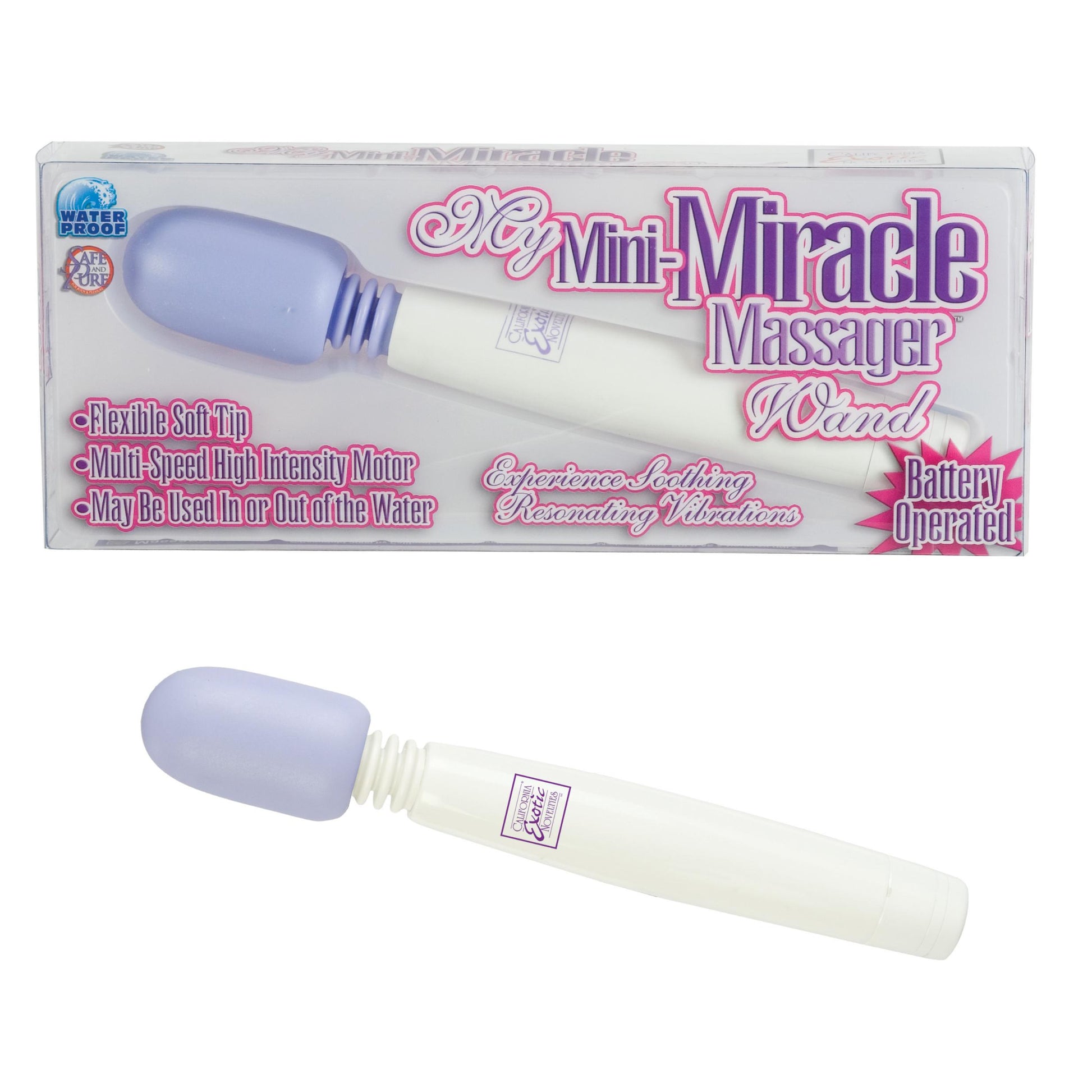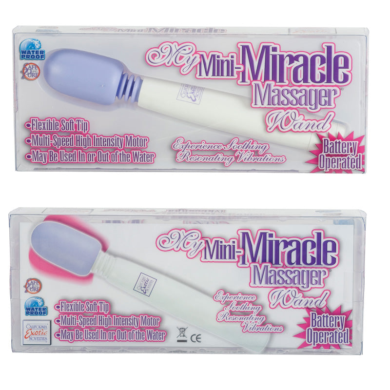 Experience soothing resonating vibrations. Waterproof may be used in and out of the water. My Mini Miracle Massager Wand comes with all the great features of the famous Miracle Massager now in a compact battery operated model. Perfect for travel. Multiple speed high intensity motor. Flexible soft tip. Safe and pure for body and pleasure. Made using phthalate free, non-toxic materials PVC tip, Polypropylene PP handle. Vibrating sex toy requires 2 AA batteries, not included. Do not leave batteries in the vibrator between uses. Always clean before and after use. Tip measures 2 inches long by 1 inch wide. Overall measures 7.75 inches long by 1 inch wide. Bulk weight: 2.7 ounces. Colors may vary. Category: For Women, Massagers, Vibrators. My Mini Miracle Massager Wand is a registered trademark for California Exotic Novelties. Sex toys and sexual wellness. New high resolution images added.