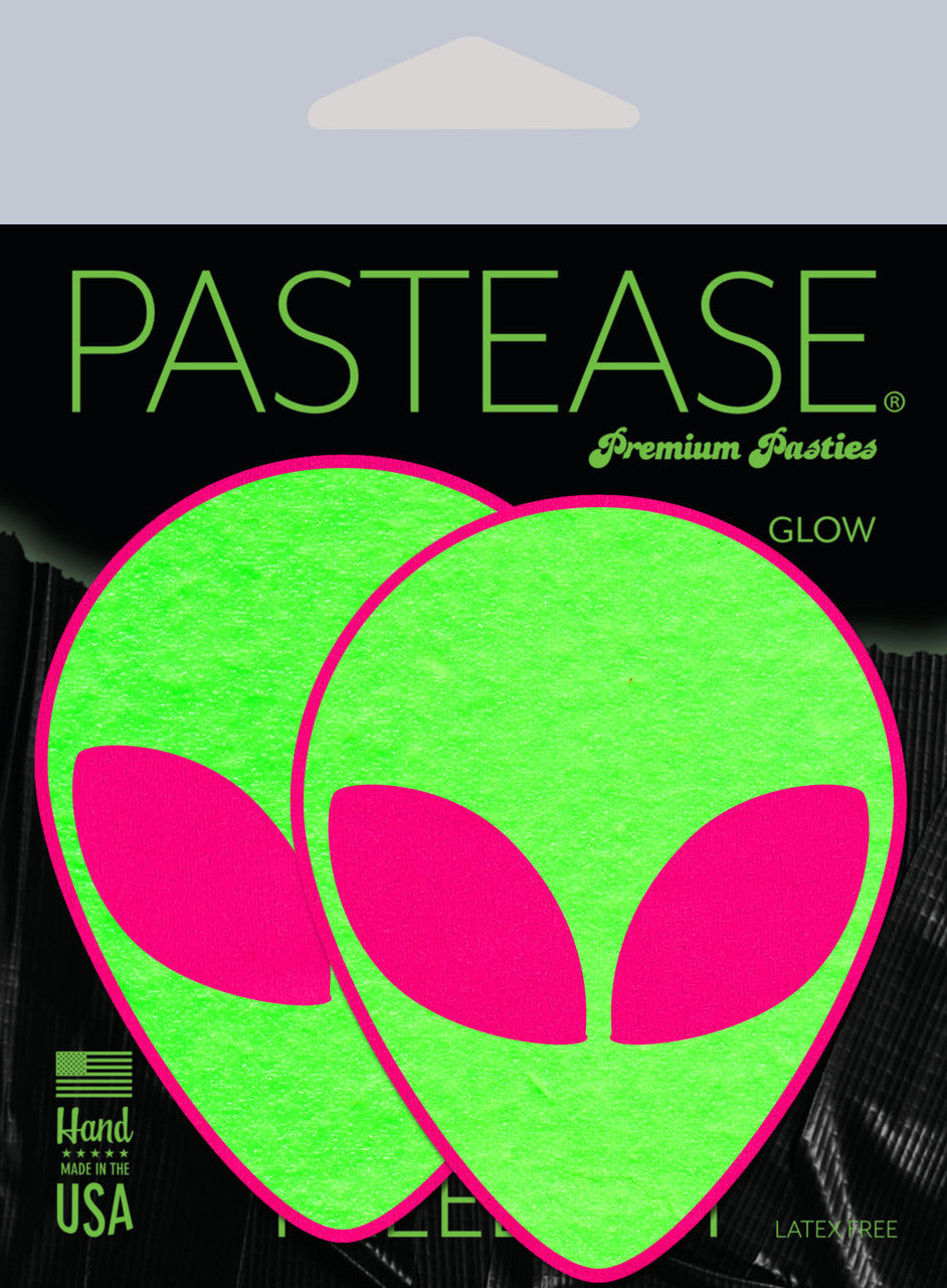 Alien: Neon Glowing Green Alien on Neon Pink Nipple Pasties by Pastease are hand made in the USA of soft form fitting material that forms to curves and resists wrinkling over hardening nipples.