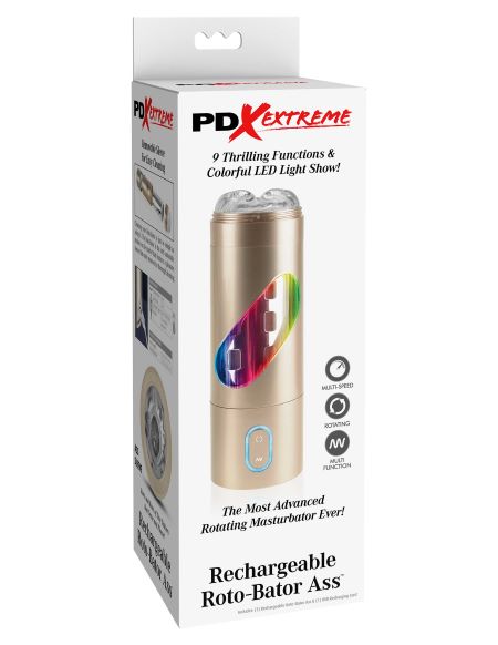 Pipedream Extreme Toyz Rechargeable Roto Bator Ass. Get ready for the most incredible, most intense, most advanced rotating masturbator ever imagined! The Rechargeable Roto Bator is the ultimate turbo powered masturbator that does all of the work for you! No more pumping, stroking, or squeezing, just push a button and enjoy mind blowing stimulation developed to make you cum harder than ever before! Unlike ordinary strokers that barely move up and down, the Roto Bator's advanced rotation mechanism puts a whole new spin on male masturbation! With each revolution of the soft sleeve, the tight ass wraps around the sensitive areas of your cock while the tiny ticklers tease and please, delivering spine tingling sensations that are better than the real thing! You get mind blowing satisfaction when you want it, for as long as you want, without any strings attached! Powered by an ultra strong motor, this full automated masturbator features nine thrilling rotation patterns to choose from. Each pattern has a colorful LED light display that changes color with each movement. The reverse oration button instantly changes direction of the spinning pleasure sleeve, allowing you to experiment with endless pleasure combinations every time you use it. It is engineered like no other masturbator on the market, with independent controls for function and rotation direction. Press the bottom button to power up the Roto Bator and cycle through all nine functions. Press the top button to instantly reverse rotation direction of the sleeve. Hold the power button down for three seconds to turn the device off. To charge your Roto Bator, plug the included USB cord into any USB plug and let it charge for 2 hours. Run time is approximately 1.5 hours per session. The long cylinder and stretchy sleeve can accommodate a wide range of sizes and girths, just be sure to use plenty of Moist Body Lotion when you insert your penis inside the pleasure sleeve.