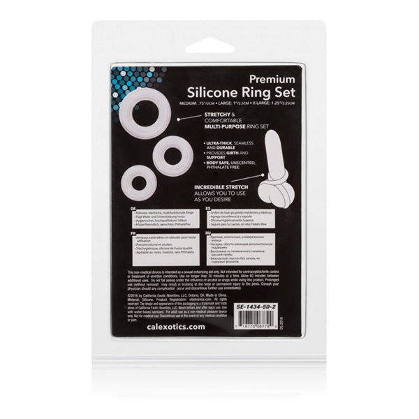 Premium Silicone Ring Set. Ultra stretchy Silicone rings. Totally seamless. Thick and durable for versatile use. Provides girth and support. Soft and comfortable. Materials: Silicone. Bulk weight 2.6 ounces. .75 inch inner ring diameter medium. 1 inch inner ring diameter large. 1.25 inches inner ring diameter XL.