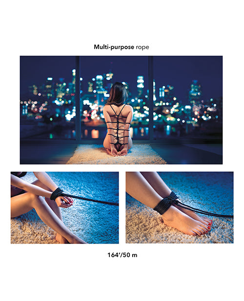 Scandal BDSM Rope 50 meter e or approximately 164 feet Black from California Exotic Novelties. Dive into your BDSM fantasies and get creative with 164 feet of Scandal BDSM Rope. Award winning Scandal Collection has created the silky smooth Shibari friendly rope of your wildest fantasies to let you dive deep into endlessly creative bondage play. Give yourself over to elevated pleasure and enhanced pleasure with every wrap and knot of this silky, slender rope. Wrap tight around wrists, gently bind ankles or create one of a kind Shibari binding on your lover for a uniquely sensational experience. The silky rope is ideal for partners looking to experience with knot and restraint. Take fantasies to the next level and scandalous with the endlessly creative BDSM Rope.