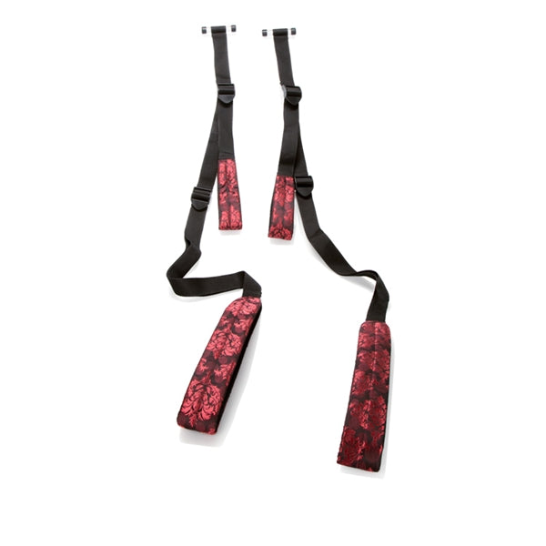 Scandal Over Door Love Swing. Over the door style universal swing harness. Sturdy straps and bar hooks for secure over the door placement. Fully adjustable to fit both standard and oversized doors. Easy to use, and easy to release, double padded arm and thigh straps. Soft and plushy on one side, with designer fabric on the other. Comfortable, adjustable cinch design for customized positioning. Safe and pure for body and pleasure made using phthalate free materials Polyester fabric, polypropylene PP straps, Acrylic dowels, polyoxymethacrylate POM buckles. 15 inches arm cuffs. 30 inches leg cuffs. Bulk weight 12.8 ounces.