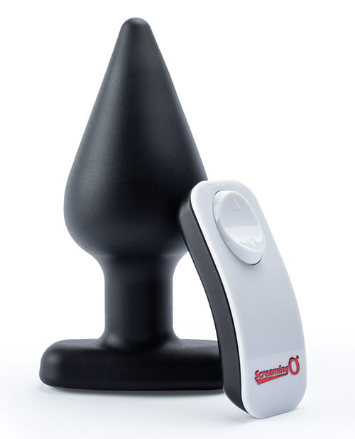 Screaming O My Secret Plug XL Black. Enjoy fun and flirty back door play no matter where you are with the Screaming O My Secret Charged Plug XL the remote controlled, rechargeable vibrating plug, now in a new, larger size. My Secret Charged Plug XL lasts over 60 minutes on a single charge, and comes with a compact remote that works up to 40 feet away. My Secret Charged Plug XL can be used with a partner to engage in stimulating sport together, or solo for quality time that is all about you. My Secret Charged Plug XL features a Powerful Positive motor that lets you toggle back and forth through 20 functions of deep, rumbling vibration, both steady and rhythmic. My Secret Charged Plug XL is waterproof, and made from lab tested, body safe True Silicone that is comfortable, flexible and compatible with all water based lubricants. My Secret Charged Plug XL now comes with a tapered, narrow base so you stay comfortable throughout play, and is backed by a limited 2 year warranty. Remote control works from up to 40 feet away. Insertion length 4 inches, diameter at widest point 1.125 inches. Base 2 inches.