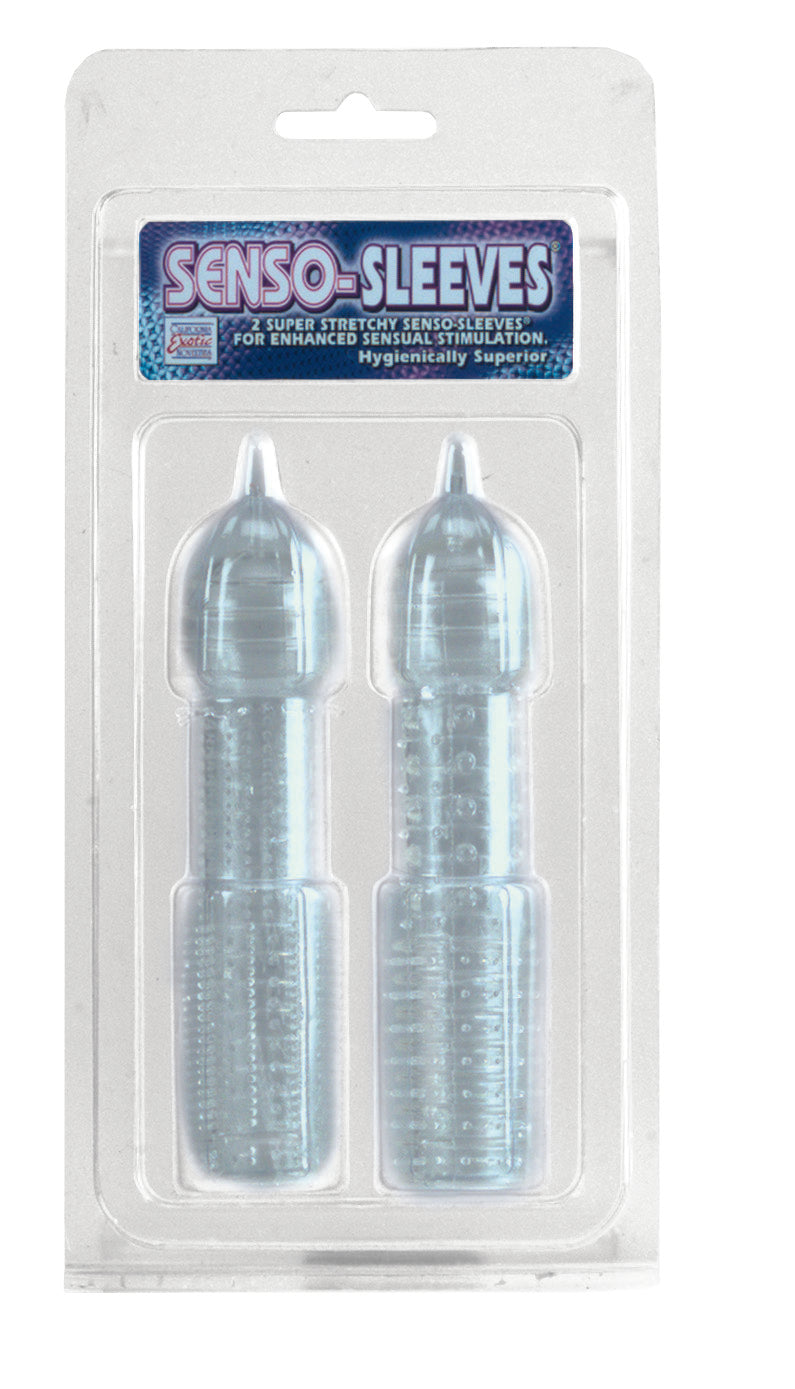 Senso Sleeves 2 Pack Clear set for both of you. 2 pack of super-stretchy Senso Sleeves for enhanced sensual stimulation. Hygienically superior clear colored masturbators. Safe and pure for body and pleasure. Made using phthalate free, non-toxic materials Thermoplastic Rubber TPR. Sleeve measures 5 inches long by 1.2 inches wide. Always clean before and after use. Senso Sleeves is a register trademark for California Exotic Novelties. Sex toys and sexual wellness. New high resolution images added.