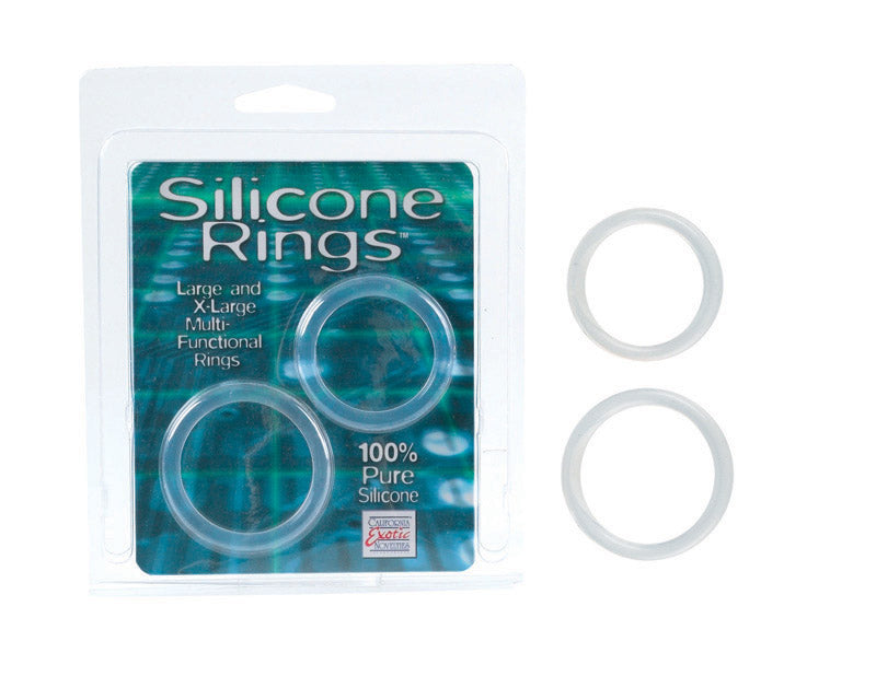 Silicone Rings Set Large and X-Large stretchy erection enhancement rings. Safe and pure for body and pleasure. Made using phthalate free, non-toxic materials Silicone. Diameter large ring is 1.5 inches. Diameter extra large ring is 1.75 inches. Do not wear a cock ring for more than 30 minutes. Cock rings give you a longer lasting erection by trapping the blood supply in the penis and intensify orgasms. Cock rings are ideal for men with premature ejaculation or erectile dysfunction. There are no guaranteed results from cock ring usage. Silicone Rings Set is a registered trademark for California Exotic Novelties. Sex toys and sexual wellness. New high resolution images added.