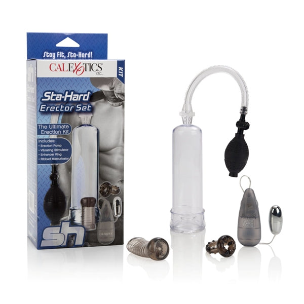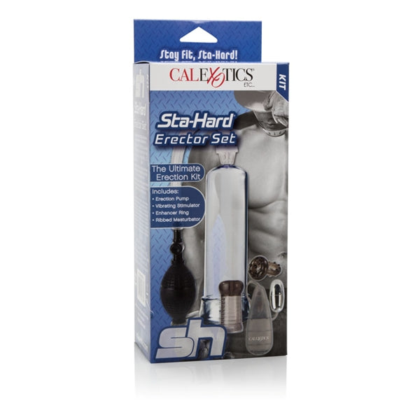 Pump kit of the year - American Pumpers Association. Stay fit, stay hard! Sta-Hard Erector Set is a complete assortment of handy tools to enhance, maintain, and sustain. Sta-Hard erection pump with clear cylinder, flanged base, removable soft donut, and easy to squeeze bulb. All Star enhancer ring. Soft, stretchy ribbed masturbator. Powerful vibrating multiple speed bullet. Vibrating sex toy requires 2 AA batteries, not included. Do not leave batteries in the vibrator between uses. Safe and pure for body and pleasure. Made using phthalate free, non-toxic materials ABS plastic pump cylinder, Thermoplastic Rubber TPR donut, masturbator, PVC hose, bulb, ABS plastic with silver plating bullet vibrator, Polypropylene PP power control. Pump measures 7.75 inches long 2.25 inches wide. Enhancer measures .75 inch long by 1.25 inches wide. Bullet vibrator measures 2.25 inches long by 1 inch wide. Masturbator measures 3.25 inches long by 1.5 inches wide. Bulk weight 11.4 ounces. Always clean before and after use. A water based lubricant is recommended. Category: For Men, Pumps, Non-Vibrating, Top Selling Sex Toys. Sta-Hard Erector Set is a registered trademark for California Exotic Novelties. Sex toys and sexual wellness. 16.