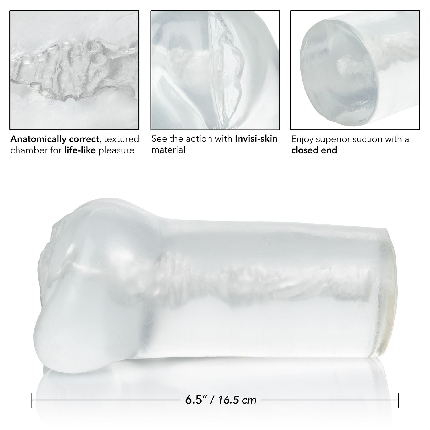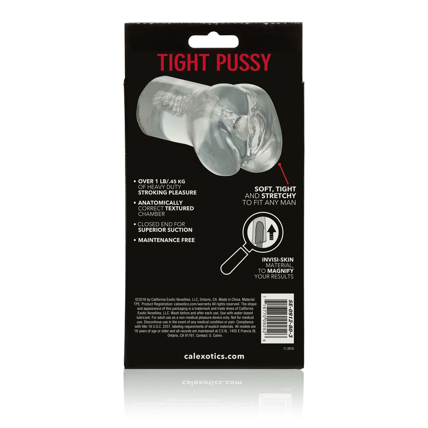 Stroke It Tight Pussy Clear male masturbation device from California Exotic Novelties. The Stroke It collection brings you the Tight Pussy stroking sleeve, made to thrill with every extra tight stroke. Dive deep into over 1 pound of heavy duty stroking pleasure with erotically detailed lips and anatomically correct chamber. Our plump stroker sleeve is great for anyone wanting a little extra oomph in their solo play. Over 1 pound of InvisiSkin material magnify your pleasure tool and deliver the heavy duty, pounding pleasure you have been craving. The indulgent stroker has a textured, anatomically correct chamber for explosive stimulation. Use this close ended sleeve with ample lubrication for powerful suction worthy of your naughtiest fantasies. InvisiSkin Thermoplastic Elastomer TPE is a super soft, ultra stretchy material with a unique, life like feel delivering pure satisfaction in every stroke. This durable sleeve is easy to use, easy to clean and requires no special care. Prior to and after each use, wash sleeve internally and externally with warm water and soap, then disinfect with the Universal Toy Cleaner.