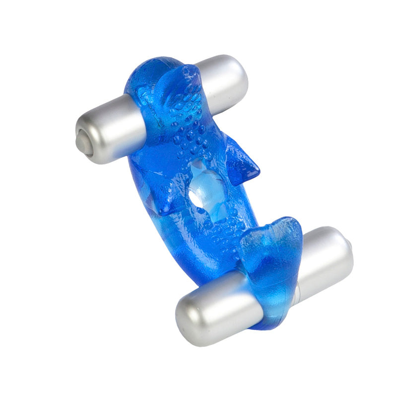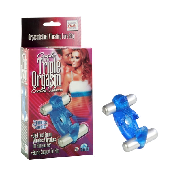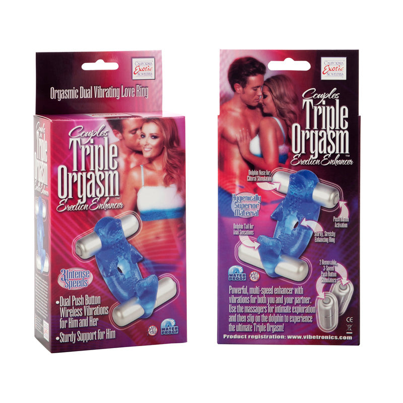 Orgasmic dual vibrating love ring. Couples Triple Orgasm Erection enhancer provides simultaneous vibrations for her and for him. Two powerful 3 speed, push button, waterproof, removable stimulators. Soft and stretchy vibrating ring provides pleasure for both partners. Safe and pure for body and pleasure. Made using phthalate free, non-toxic materials Thermoplastic Rubber TPR enhancer, ABS plastic with metallic plating stimulators. Batteries included 6 watch size to power up, 12 included. Dolphin shaped ring enhancer measures 3.5 inches long by 1.5 inches wide. Stimulator bullet measures 2.5 inches long by .75 inch wide. Bulk weight 2.4 ounces. A water based lubricant is recommended. Always clean before and after use. Couples Triple Orgasm Erection Enhancer is a registered trademark for California Exotic Novelties. Sex toys and sexual wellness. New images added June 3, 2013.