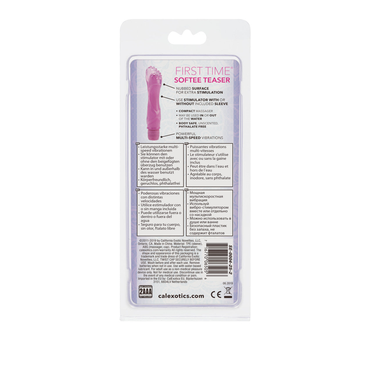First Time Softee Teaser Vibe . Velvety soft pleasure products designed for first time or experienced users. Make it a memorable experience with the First Time Collection! Velvety soft, power packed, and easy to use. Multiple speed vibrations. Vibrating sex toy requires 2 AAA batteries, not included. Made using phthalate free, non-toxic materials Thermoplastic Elastomers TPE sleeve, ABS plastic vibrator. Teaser Vibe measures 5.25 inches long by 1.5 inches wide. Bulk weight 2.5 ounces. Softee Teaser Vibe can safely be used to stimulate the clitoris g-spot in women, or p-spot or prostate in men. Beginners sex toy. Always clean before and after use plus between partners. Remove batteries before storage to increase the life of all sex toys. First Time Power Vibes is a registered trademark for California Exotic Novelties. Video