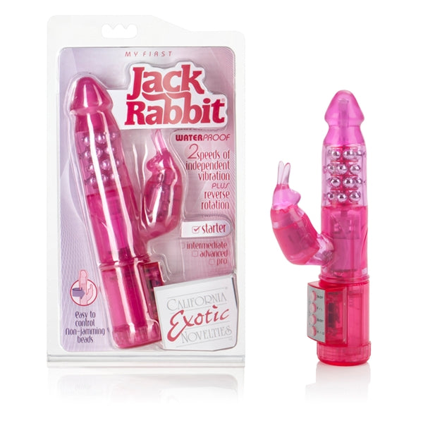 You will always remember your first! My First Jack Rabbit Vibrator is waterproof and designed with the first time user in mind! Simple, easy to use Jack Rabbit. Jelly soft head provides for easy insertion. Magical metal beads come with a reverse drive. Rotating pleasure beads provide extra stimulation internally to vagina and g-spot. 2-speed powerful bunny tickles and teases the clitoris with powerful vibrations. Easy to operate with its push button control. Easy to load battery pack. Soft textured dual stimulating sex toy for women. Safe and pure for body and pleasure. Hygienically superior Thermoplastic Rubber TPR. Made using phthalate free, non-toxic materials PVC. Vibrating sex toy requires 4 AA batteries, not included. Do not leave batteries in the vibrator between uses. Vibrator measures 5 inches long by 1.25 inches wide. Bulk weight 9.3 ounces. A water based lubricant is recommended. Always clean before and after use. Category: For Women, Vibrator, Vibrators, Top Selling Sex Toys. My First Jack Rabbit is a registered trademark for California Exotic Novelties. Sex toys and sexual wellness. New images added 16.