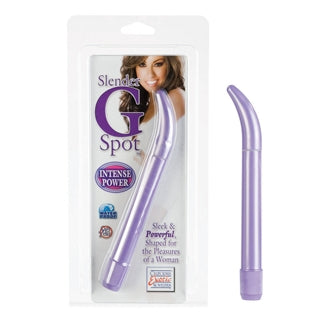 Slender G-Spot 7" Vibrator is a classic ultra thin smooth g-spot probe. Multiple-speed vibrations, slimline, seamless massagers. Safe and pure for body and pleasure. Made using phthalate free, non-toxic materials: ABS plastic. Vibrator measures 6.75 inches long by .6 inch wide. Bulk weight 1.7 ounces. Vibrating sex toy requires 2 AAA batteries, not included. Do not leave batteries in the vibrator between uses. A water based lubricant is recommended. Category: For Women, Vibrator, Vibrators. Slender G-Spot Massagers is a registered trademark for Vibrators from California Exotic Novelties. Sex toys and sexual wellness. New images added May 18, 2013. Colors may vary. -old