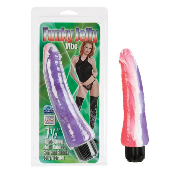 Funky Jelly Vibe Pink/Purple is one of the most unique sex toys out there! Soft and pliable, multi-colored, powerful vibrators. Multiple peed, multiple colors waterproof jelly vibe. Safe and pure for body and pleasure. Made using phthalate free, non-toxic materials PVC shaft, ABS plastic base. Vibrating sex toy requires 2 AA batteries, not included. Do not leave batteries in the vibrator between uses. A water based lubricant is recommended. Always clean before and after use. Category: For Women, Vibrator, Vibrators. Funky Jelly Vibe is a registered trademark for California Exotic Novelties. Sex toys and sexual wellness. Colors may vary. New images June 1, 2013.
