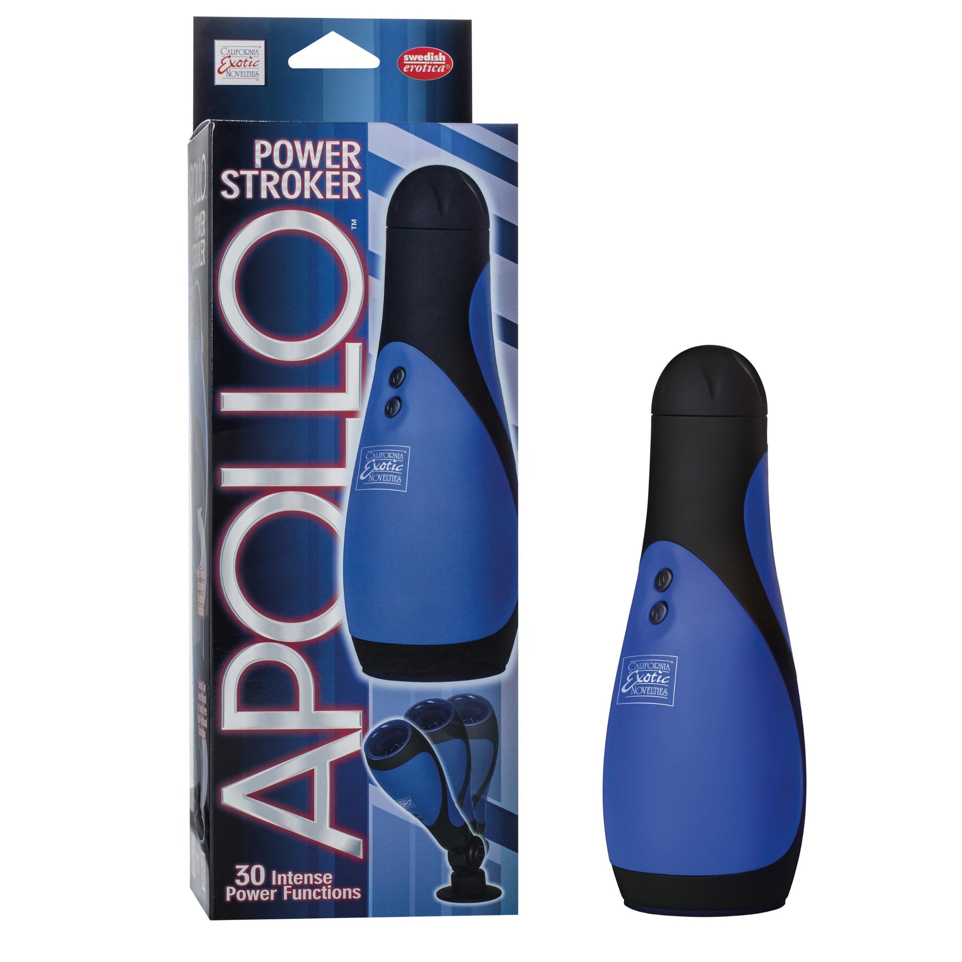 Apollo Power Stroker . Totally self contained power stroker with removable suction cup base. Vibrating pleasure stroker with deep throat action. Sleeve ergonomically shaped for absolute form and function. 30 incredible functions of vibration, pulsation and escalation. Easy push button control. Optional multi-position hands-free suction cup swivel mount included. Safe and pure for body and pleasure made using phthalate free materials Thermoplastic Rubber TPR sleeve, ABS plastic button, ABS plastic with polyurethane PU Cote case. Vibrating sex toy requires 4 AA batteries, not included. Bulk Weight: 15.4 ounces. 3.5 inches by 2.25 inches chamber. 8.5 inches by 3 inches overall. Category: For Men, Masturbators, Non-Beaded.