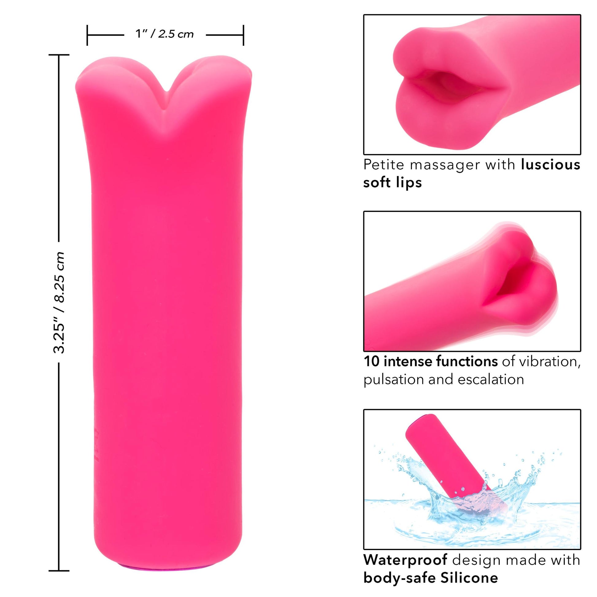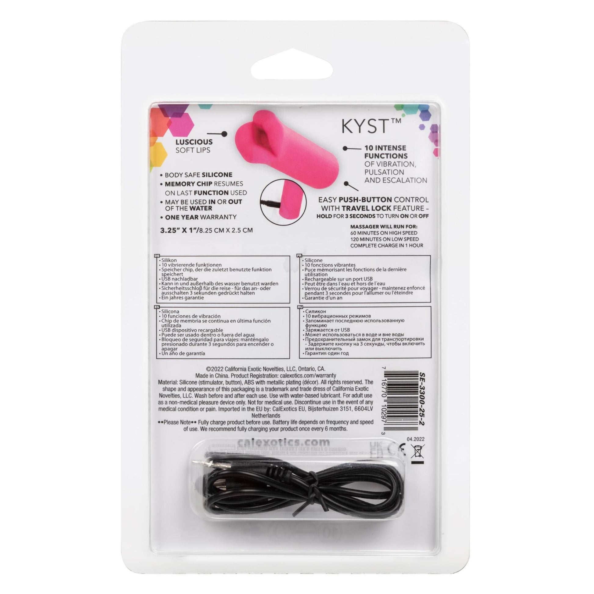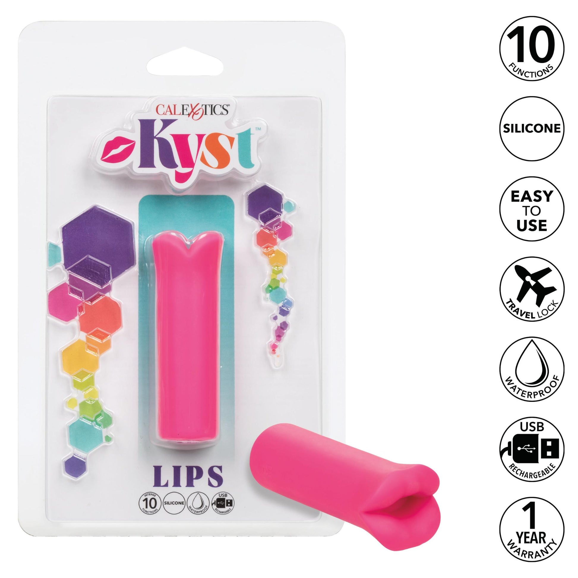 Kyst Lips Blue Mini Massager from California Exotic Novelties. No matter where your travels take you, enjoy a little me time with the Kyst Lips mini massager. The powerful mini silicone bullet is packed with 10 functions of vibration and luscious, pliable lips. The mini massager fits between your fingers to let you deliver pinpoint tantalization and a thrilling kiss with rumbling vibrations. Get playful while you cycle through 10 indulgent vibration, pulsation and escalation functions with the easy touch control button. The premium Silicone and plushy soft lips are great for exploring sensual sweet spots and intimate pleasure points with ease. With a smooth shape and supple surface, you will be able to indulge in thrilling vibrations from any angle your desire. Charge up your passion in just 1 hour by plugging the provided USB cable into the self sealing charging port on the base of the massager. Get playful with up to 120 minutes of vibrations with every charge. The slim massager's discreet size makes it the perfect travel companion, letting you embrace radiating pleasure wherever your fantasies take you.